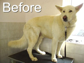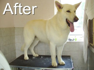 Shep and Simba are German Sheperds. They both live outside and have developed a huge coat as a result. They were both washed in scruffychops ‘Zest in Show’ which has lovely grease and dirt cutting qualities. Then they were conditioned in Scruffychops ‘Muddy marvelous’ conditioner. They were then blasted nearly dry and finished with a brush and comb. The feet and hocks were trimmed with scissors and thinners.